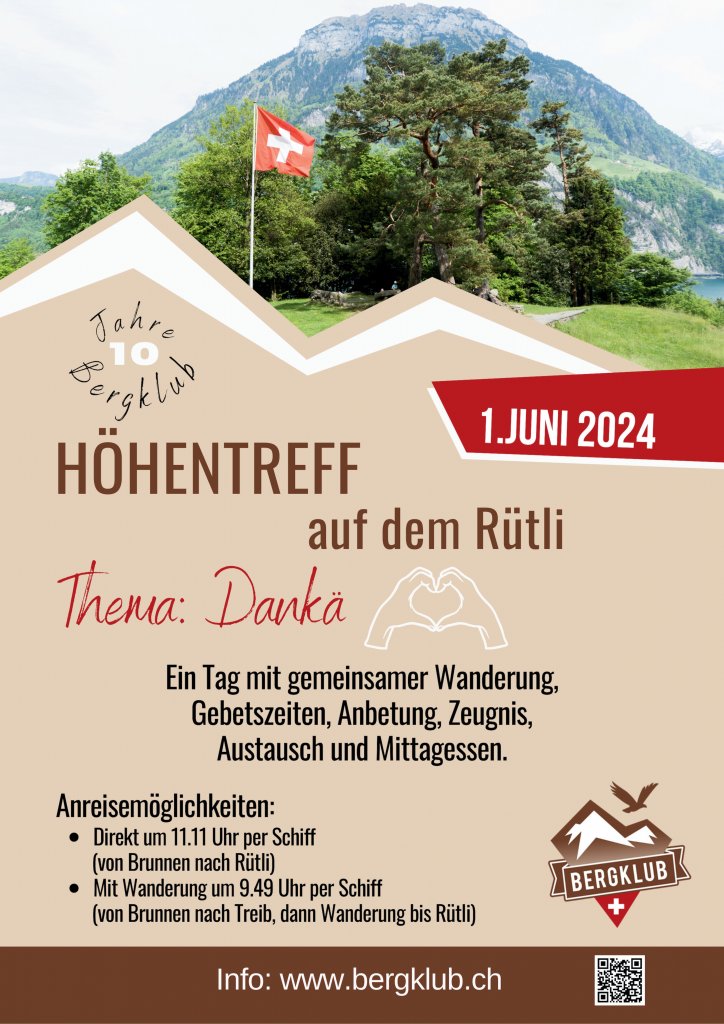 In unserem Jubiläumsjahr geht es beim Höhentreff an einen speziellen Ort in der Schweiz. Für einmal geht es nicht hoch in die Berge, sondern an den Fuss der Berge, zum Rütli. "Dankä" wird das Thema sein. In all den Unruhen wollen wir unseren Blick darauf richten, was Gott Gutes tut, in unseren Leben und in der Schweiz. Wir haben mehr als genug Gründe, um Dankbar zu sein. Gemeinsam werden wir Gott loben, ermutigt werden und für unser Land im Gebet einstehen. EckdatenDatum: 01. Juni 2024 AnreiseEmpfehlung: Schiff 11:11 Uhr ab Brunnen (See) ca. 10-15min Laufweg ab Brunnen Bhf. In Brunnen befinden sich kostenpflichtige Parkplätze. Wanderung09:49 Uhr Abfahrt Schiff ab Brunnen (See) Die Wanderung hat eine mittlere Schwierigkeit, Gutes Schuhwerk empfohlen. Die Wanderung kann verkürzt werden durch eine Standseilbahn ab Treib bis Seelisberg (50min Laufweg mehrheitlich abwärts). VerpflegungJeder bringt seinen eigenen Lunch und genügend zu Trinken mit. Für Kaffee und Kuchen am Nachmittag ist gesorgt. SitzgelegenheitEs gibt kaum Sitzgelegenheiten. Wir empfehlen einen Klappstuhl oder eine Sitzdecke mitzunehmen. Übersetzung Französisch:Am diesjährigen Höhentreff wird es eine Übersetzung auf Französisch geben. AnmeldungFür eine bessere Planung sind wir dankbar um eine Anmeldung bis am 18. Mai. Weitere Fragen?Wendet euch an: