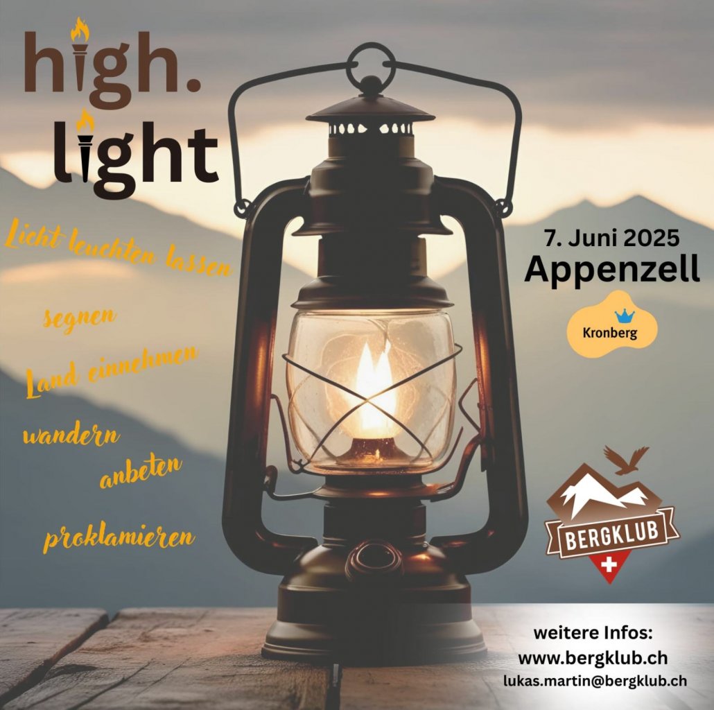 Komm mit! Wir gehen auf einen Berg zum Beten und zünden symbolisch ein Feuer an, dass Gottes Licht leuchtet. Es gibt eine Hoffnung, die alles Dunkel übersteigt und diese Hoffnung soll wieder über allem leuchten! Nächstes High.Light: 07. Juni 2025, 11:10 Uhr Bergstation Kronberg, Appenzell Innerroden Nach dem Ende um ca. 15:00 Uhr besteht die Möglichkeit gemeinsam zu Fuss nach unten zu wandern. Mitnehmen: Lunch mit Bräteln Fackel, Gebetsfahnen, Schofar |
